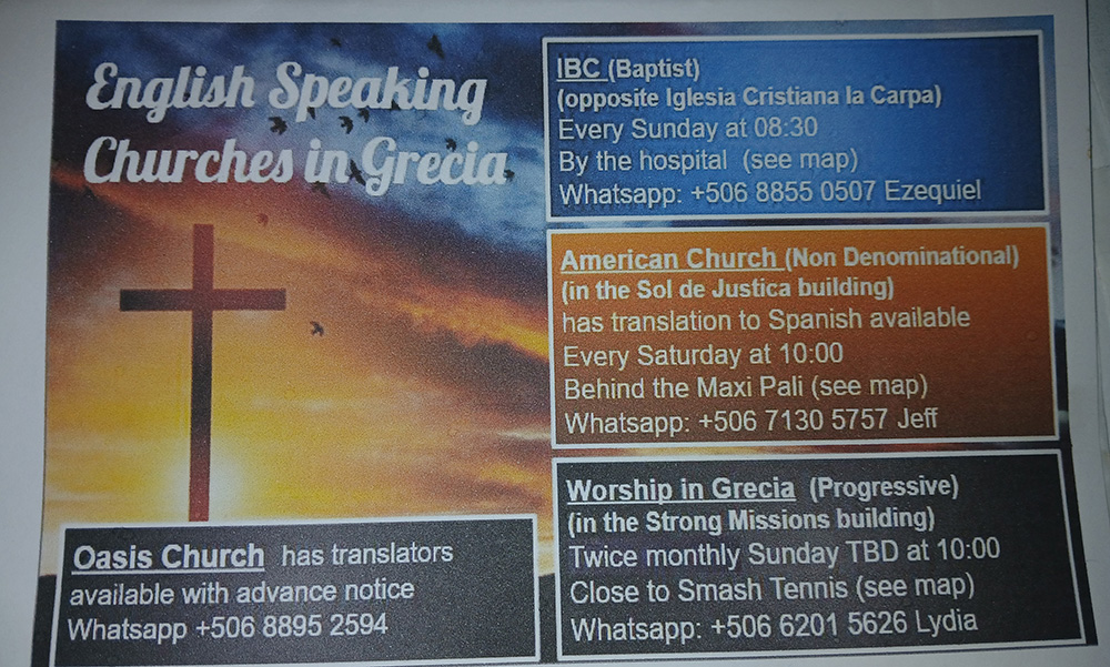 Catholic Gringos who are interested in Catholic Services in English in Atenas are invited to contact Dave Davis, he is compiling an email list. His group has Church approval to do a communion service with prayers and Eucharistic Service in English as well as a Mass with a translator etc. You can reach Dave at 8759 3433.